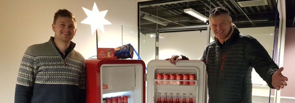 ØNSKJER GOD JUL: På biletet har Pål Anders Kårstad i PEAK Sunnfjord og Webmegling, og Geir Henning Nore i INTIN AS fått på plass eit viktig møbel i dei nye lokala. (Foto: Rune Viken)
